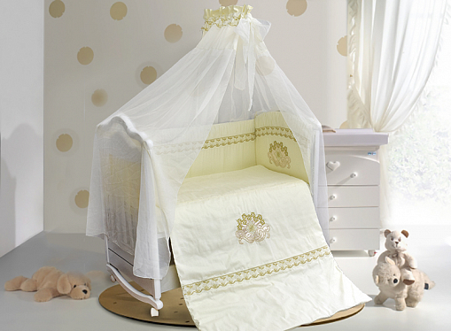 Комплект в кроватку Bombus "Инфанта" 1451 7 предметов  необыкновенно нежный и, в то же время, роскошный. Такой комплект с невероятно изысканным дизайном украсит детскую кроватку и подарит вашему малышу спокойный сон и отдых. Комплект выполнен из шелковистого сатина. Вы по достоинству оцените высокую износостойкость, надежность и долговечность этого текстильного материала. Сатин – полностью натуральный и экологически безопасный материал, прекрасно подходящий для комплектов постельного белья новорождённым детям. Бортики и одеяло украшены кружевом. На бортике в изголовье и на одеяле выполнена эксклюзивная 3D вышивка, выполненная серебряными нитями. Очарование этому комплекту придают серебряные кружева, которыми украшены бортики этого комплекта. Нежный балдахин изготовлен из мягкой вуали и украшен вверху бантом. Это элегантный и красивый аксессуар для детской кроватки. Создает ощущение уюта и красоты.  Здоровый сон вашему малышу будет обеспечен с этим великолепным комплектом.