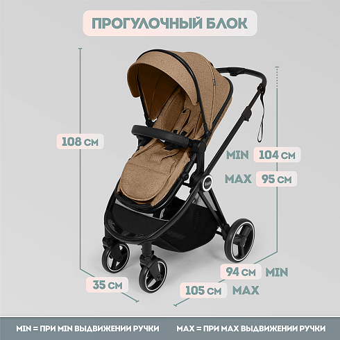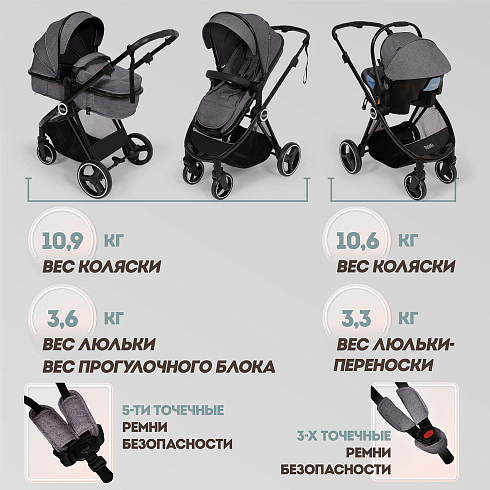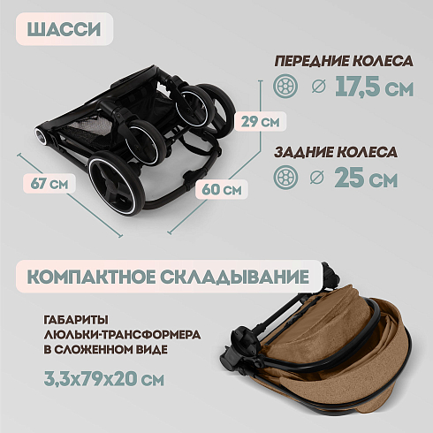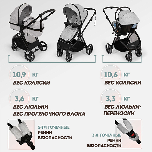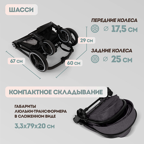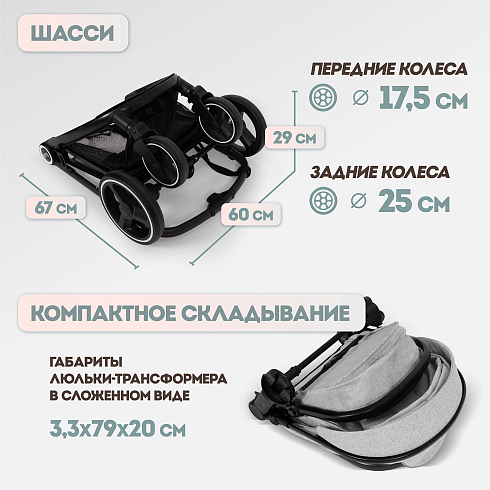 Отличительной особенностью данной модели является предельно компактное и простое сложение. Всего три движения, и рама готова к эксплуатации — осталось только установить на нее трансформирующийся блок и выбрать нужную трансформацию «люлька» или «прогулка», или люльку-переноску, идущую в комплекте поставки вместе с адаптерами. Блок-трансформер «люлька-прогулочный блок» и люлька-переноска также отличаются малым весом, компактными размерами и необременительным монтажом. Благодаря идеальным габаритам и быстроте складывания механизмов коляска не только очень удобна для использования на прогулках недалеко от дома, но и максимально приспособлена для поездок на автомобиле.