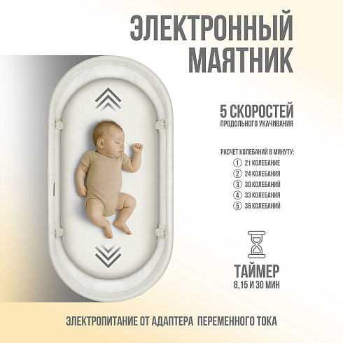 Эта электронная колыбель оснащена продольным маятником с 5 скоростями укачивания и таймером (8, 15 или 30 минут). Укачивается только донышко, поэтому приставную кроватку можно ставить вплотную к взрослой кровати.КОНТРОЛЬ ВЕСА — КАК У ПЕДИАТРА