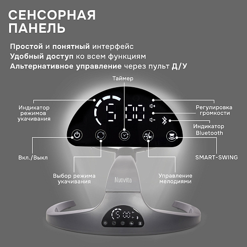 Интуитивно понятное управление колыбелью осуществляется через сенсорную панель или удобный пульт дистанционного управления, что делает взаимодействие с устройством легким и комфортным.