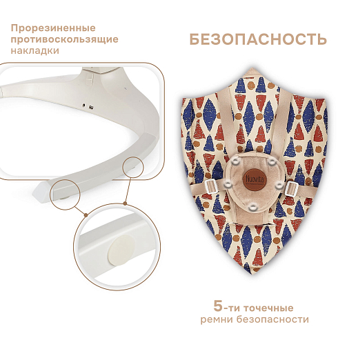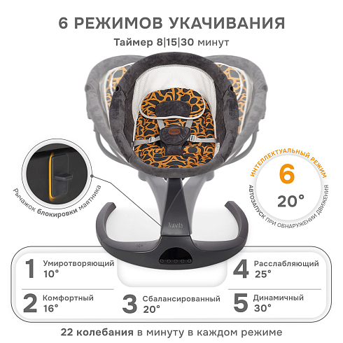 Продуманная система регулировки наклона ложа, позволяет устанавливать угол от 165° до 180°. Пятиточечные ремни безопасности надежно удерживают ребенка в качелях, обеспечивая ему максимальную защиту даже в активные моменты. Система блокировки раскачивания предотвращает нежелательные движения, обеспечивая защиту даже при случайных прикосновениях к колыбели.
