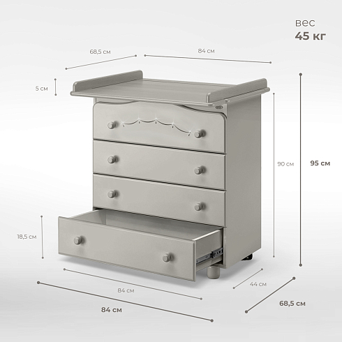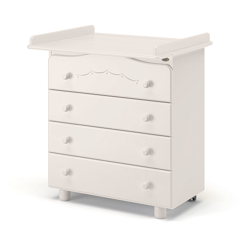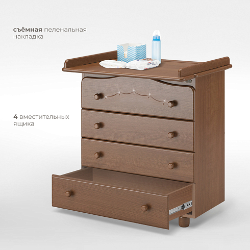 • четыре вместительных ящика с эргономичными округлыми ручками, в которые помещаются все детские вещи, аксессуары по уходу за малышом и игрушки. Верхний ящик украшен нежным растительным орнаментом с изящными изгибами;