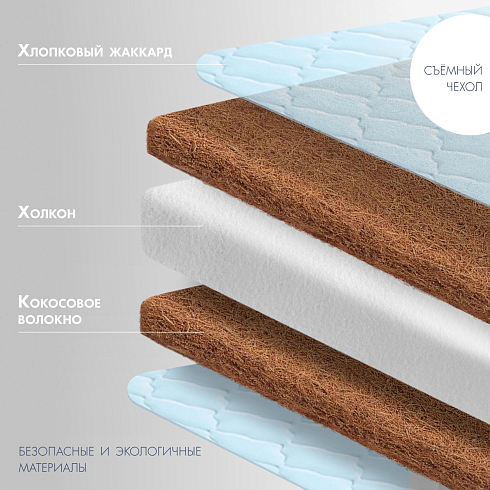 Детский матрас Nuovita Gesto. Максимальная нагрузка на матрас 30 кг. Состав наполнителя:  холкон 8 см + кокос 1 см + кокос 1 см. Жесткость матраса выбирается по сезонности либо по комфортности, одна сторона матраса обладает жесткостью "выше среднего", другая - "средней". Чехол матраса съёмный, выполнен из хлопкового жаккарда.