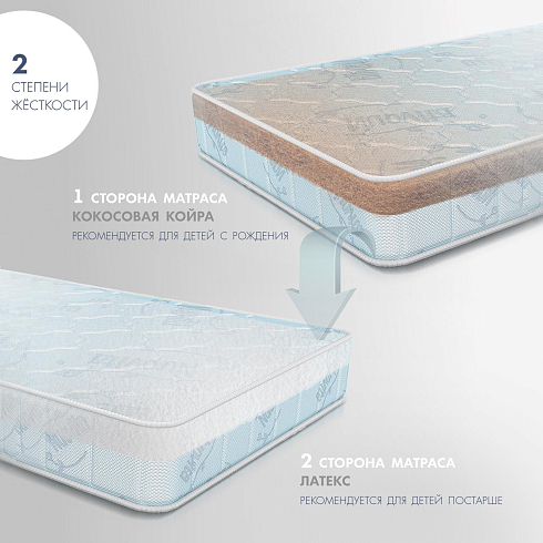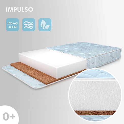 Детский матрас Nuovita Impulso. Максимальная нагрузка на матрас 30 кг. Состав наполнителя:  холкон 8 см + кокос 1 см и аэраторы. Жесткость матраса выбирается по сезонности либо по комфортности, одна сторона матраса обладает жесткостью "выше среднего", другая - "средней". Чехол  матраса съёмный, выполнен из хлопкового жаккарда.