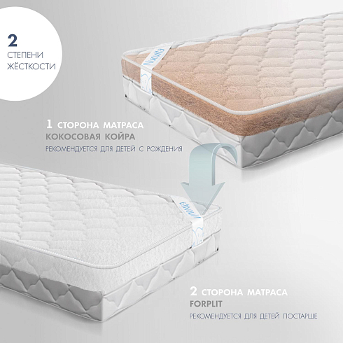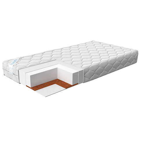 Детский матрас Nuovita Niazzi. Максимальная нагрузка на матрас 30 кг. Состав наполнителя: кокос 1 см + Forplit 10 см + спанбонд. Жесткость матраса "средняя". Чехол матраса съёмный, выполнен из стеганного трикотажного полотна.