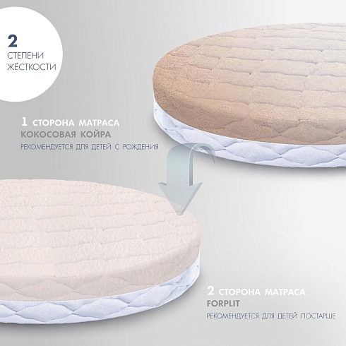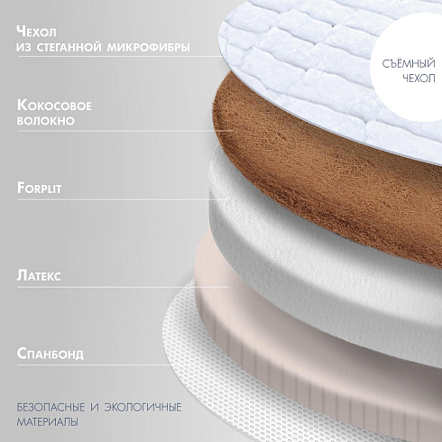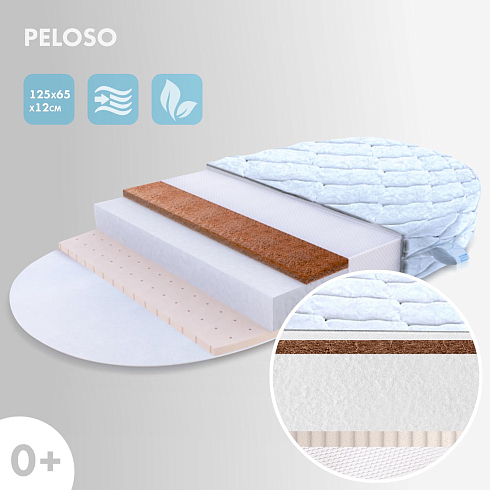 Детский матрас Nuovita Peloso. Максимальная нагрузка на матрас 30 кг. Состав наполнителя: латекс 1 см + Forplit 10см + кокос 1 см + спанбонд. Жесткость матраса "средняя". Чехол матраса съёмный, выполнен из стеганной микрофибры.