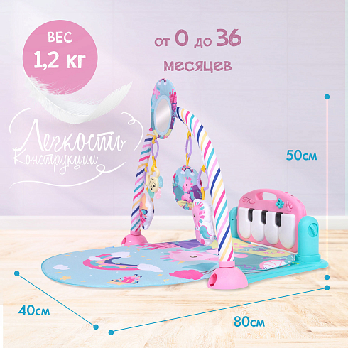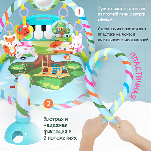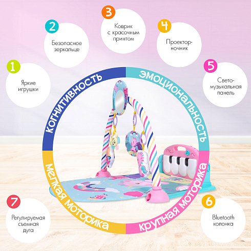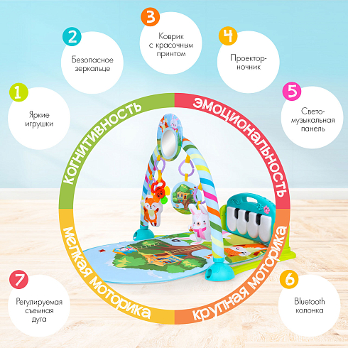 Совсем скоро ваш малыш научится переворачиваться, и для него откроется новая игра: лёжа на животике, он сможет дотягиваться ручками до игрушечного пианино в изголовье коврика и радоваться световым и звуковым эффектам от нажатия клавиш. И да, это тоже не просто развлечение: такое занятие формирует у младенца представление о причинно-следственных связях. Родители же по достоинству оценят технологичность коврика: свето-музыкальная панель может использоваться как Bluetooth-колонка — подключите её к своему телефону, чтобы малыш отдыхал под любимую музыку!