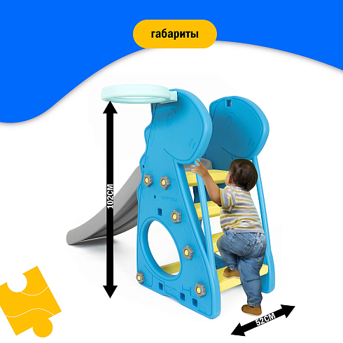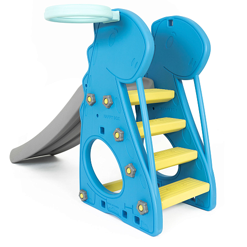 Детский игровой комплекс JM-755D от корейского бренда Happy Box рассчитан на малышей от 3-лет и старше. Конструкция из высококачественного пластика сделана с учетом физиологии детей, яркий привлекательный дизайн захватывает их внимание и повышает интерес к игре. На этой детской горке ребенок может не только покататься, но и поиграть в баскетбол — на стенке крепится корзина, в комплекте идет мяч. В игровой форме малыш будет развивать мышцы всего тела, координацию движений, ловкость и внимательность.
