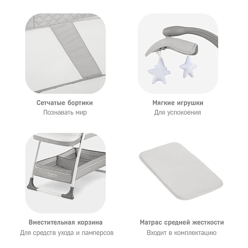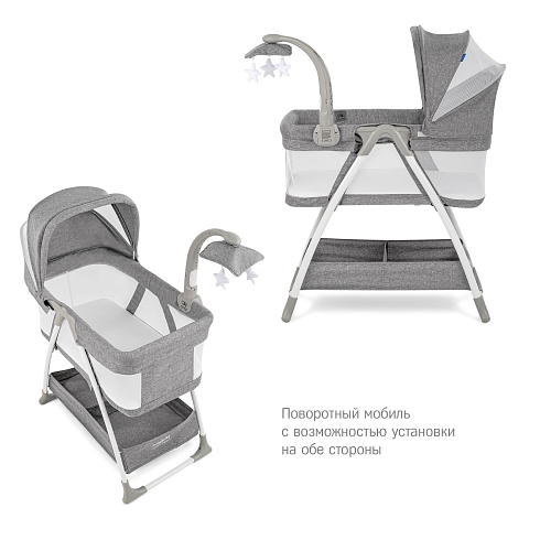 колыбель, съёмный матрасик, наматрасник, капор, мобиль с игрушками, тканевая корзина для белья