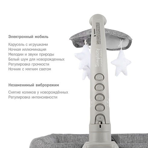 В комплекте с колыбелью поставляется современный музыкальный мобиль с подвесными игрушками, который работает от батареек. Особенностью модели Simplicity 3010 Classic является возможность установки мобиля как справа, так и слева на люльке колыбели. Мобиль выполняет множество функций: ночная подсветка, бегающие огоньки, виброукачивание, вращение игрушек и проигрывание мелодий. Присутствует регулировка интенсивности вибрации и громкости музыки, а также таймер. Виброукачивание используется для снятия коликов у новорожденных.