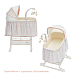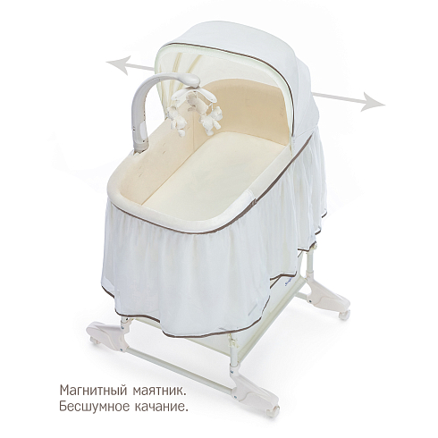 Колыбель рекомендуется для использования с первых дней жизни ребенка, максимально допустимый возраст малыша составляет 5–6 месяцев (при весе не более 10 кг). Тканевый чехол украшен романтичной оборкой, а внутри колыбели находится прочный матрасик с наматрасником. Складной капор обеспечит малышу защиту от света. Расположенная в основании тканевая корзина пригодится для хранения постельного белья и предметов ухода.