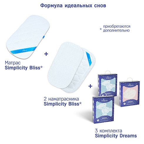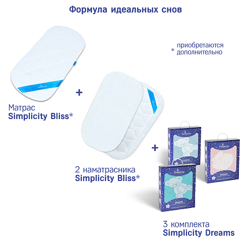Simplicity Dreams — это комплект детского постельного белья высочайшего качества для использования в люльках, колыбелях и приставных кроватках с размером спального места 80х41 см.