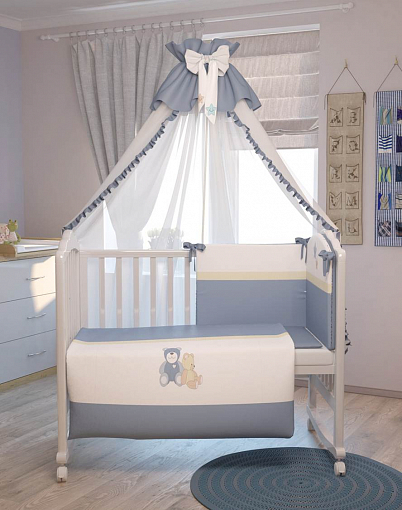 Комплект в кроватку Polini "Плюшевые Мишки" 7 предметов - создаст уют в детской кроватке и согреет в прохладные дни. Борт защитит малыша от сквозняков, пыли и солнца. Чехлы бортика снимаются, что очень удобно при стирке. Изготовлен комплект из натуральных, гипоаллергенных материалов 100 % хлопка высочайшего качества. Оригинальная вышивка комплекта придаст неповторимый стиль в детской.