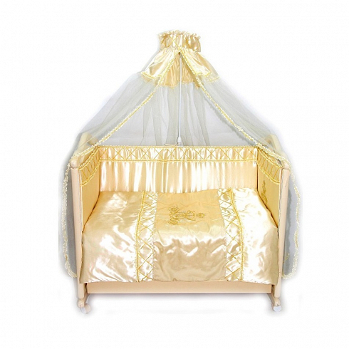 Комплект в кроватку Bombus "Золушка", 7 предметов - из натурального хлопка высокого качества. Роскошный, белый балдахин с золотой отделкой укроет кроватку и защитит малыша от назойливых насекомых, защитный борт на весь периметр кроватки исключит сквозняки и создаст уютное гнездышко.