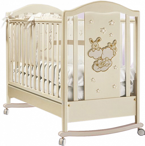 Детская кроватка Romance компании Feretti обладает роскошным классическим дизайном и декором в виде милых зайчат, играющих и спящих в облаках. Блеск декора  создает атмосферу легкости и элегантности. Кроватка Romance - это словно уютное облачко, на котором малышу будут сниться только спокойные и приятные сновидения.