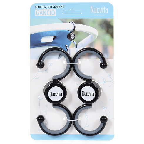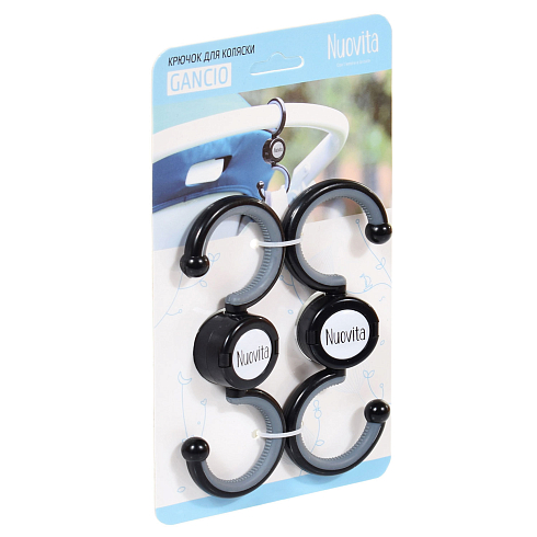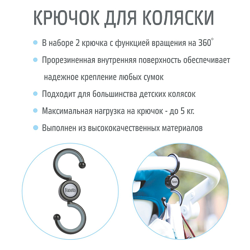 Крючок для коляски NUOVITA Gancio - универсальный крючок для коляски удобно использовать для покупок. Крючок может поворачиваться на 360 градусов и подходит практически всех моделей колясок. В наборе 2 крючка. Прорезиненная внутренняя поверхность крючка обеспечивает надежную фиксацию сумки,пакета. Максимальная нагрузка до 5 кг.