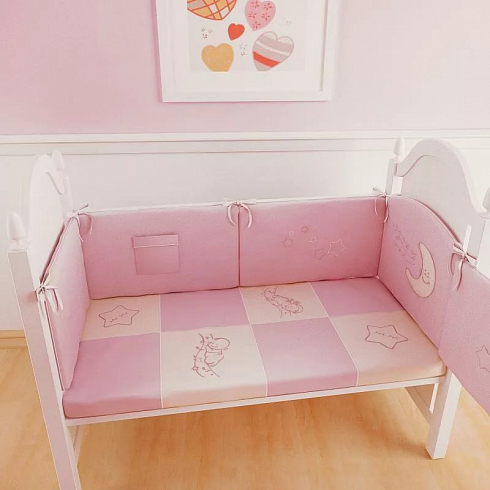 бампер-бортик со съемными чехлами: 380 см одеяло (наполнитель холлотек): 110х140 см подушка (наполнитель холлотек): 40х60 см пододеяльник: 112х147 см наволочка: 40х60 см простыня на резинке: 125х65 см балдахин (вуаль)