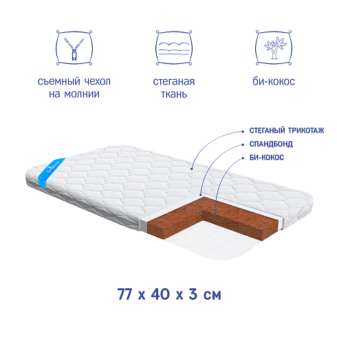 Матрас состоит из съемного чехла (трикотажное полотно), спандбонда и жесткой кокосовой основы. Эти легкие и дышащие материалы гипоаллергенны, и не провоцируют раздражения и опрелостей на коже младенца. Матрас хорошо вентилируется и быстро просыхает. Основа матраса – это плита из би-кокоса высокой плотности и толщиной 2 см. Такая толщина обеспечивает хороший тепло- и воздухообмен, а жесткость основы создаёт оптимальные условия для правильного формирования позвоночника у новорожденных.