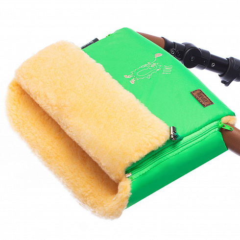 Муфта крепится на ручке коляски при помощи разъемных «молний», вшитых по бокам. Подобное решение делает данную модель теплее кнопочных аналогов, поскольку замки плотно закрывают боковые срезы, не допуская задувания ветра. Глубина регулируется при помощи меховых отворотов, и фиксируется пластиковыми зажимами. По центру верхняя и нижняя части соединены двумя кнопками. Вся фурнитура имеет отличное качество, подобрана в цвет ткани и служит дополнительным украшением изделия.