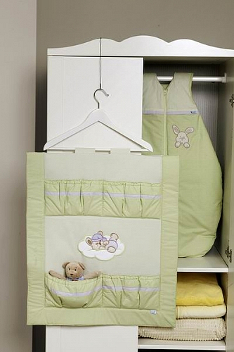 Панно Feretti  RABBIT – функциональное, красивое, предназначено для хранения мелочей и аксессуаров ребенка, оснащено кармашками. Крепится панно на спинку кроватки или на стену. Изготовлено из 100% хлопка высочайшего качества. Украшено вшивкой.  Размер: 70х80 см.