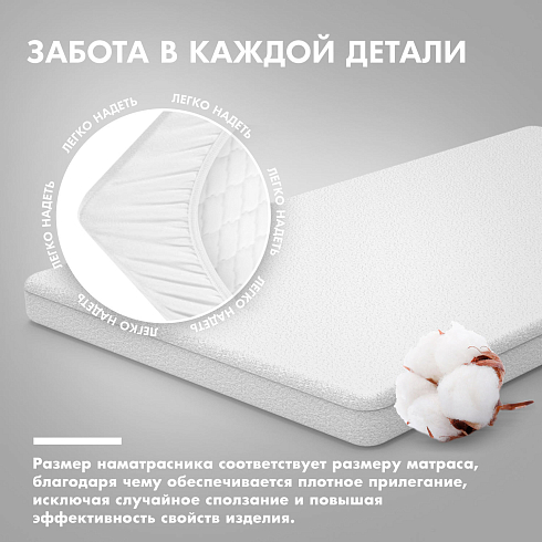 Антибактериальная пропитка ткани снижает риск появления неприятного запаха и является гипоаллергенной, что позволяет применять изделие для всех без исключения детей. Края наматрасника имеют аккуратную обработку. Фиксирующие резинки пришиты с применением специальных трикотажных швов.