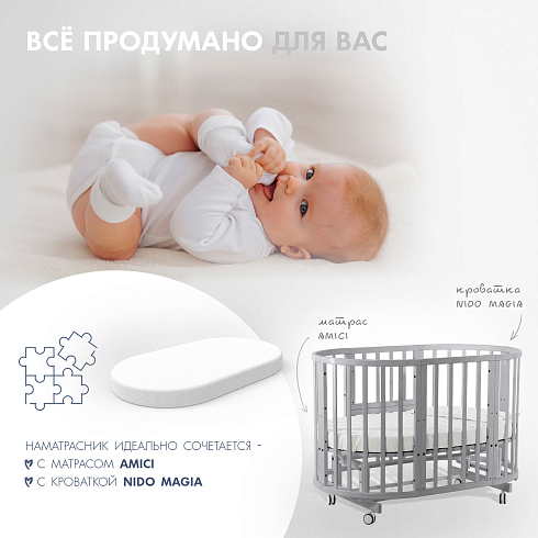 Модели для круглых и овальных кроваток изготовлены с резинкой по всему периметру. Для прямоугольных кроваток предусмотрены резинки по углам. Размеры чехла-наматрасника Nuovita максимально соответствует параметру матраса, что способствует прочной фиксации и исключает случайное сползание.