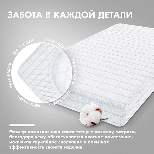 Антибактериальная пропитка ткани снижает риск появления неприятного запаха и является гипоаллергенной, что позволяет применять изделие для всех без исключения детей. Края наматрасника имеют аккуратную обработку. Фиксирующие резинки пришиты с применением специальных трикотажных швов.