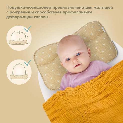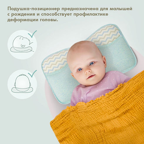 Подушка предназначена для малышей первого года жизни. Форма изделия разработана с учетом физиологии младенца и полностью соответствует особенностям его головы и позвоночника. В средней части имеется углубление, которое снижает нагрузку на шейные позвонки, а утолщения в виде валиков по краям помогают сохранить анатомически правильное положение головы.