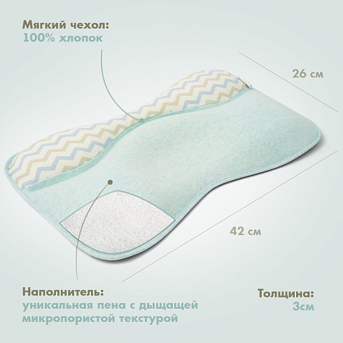 Наполнитель подушки — это уникальная пена с дышащей микропористой текстурой, эластичная и упругая. Она сертифицирована для применения в детских изделиях и обладает устойчивостью к пылевым клещам. Мягкий дышащий чехол сшит из 100% натурального хлопка.