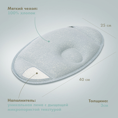 Наполнитель подушки — это уникальная пена с дышащей микропористой текстурой, эластичная и упругая. Она сертифицирована для применения в детских изделиях и обладает устойчивостью к пылевым клещам. Мягкий дышащий чехол сшит из 100% натурального хлопка.