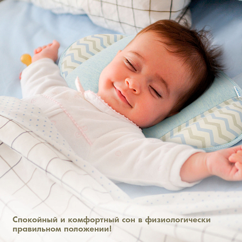 Подушка предназначена для малышей первого года жизни. Форма изделия разработана с учетом физиологии младенца и полностью соответствует особенностям его головы и позвоночника. В средней части имеется углубление, которое снижает нагрузку на шейные позвонки, а утолщения в виде валиков по краям помогают сохранить анатомически правильное положение головы.